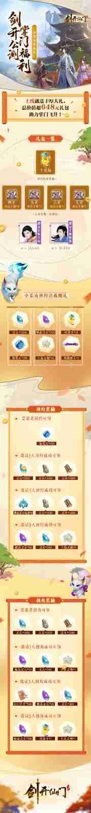 游戏为大家准备了海量的福利,,,,包括上线即可获得的全渠道预约礼包、、十连抽等福利,,输入密令“JK666”、、、“JK888”即可领取紫色弟子,,达到金丹期后还有功法宝箱可领,,,,助力全宗上下实力提升……所有奖励总价值超过648元,,,而邀请好友一起体验,,,,更可以获得额外的奖励哦~
